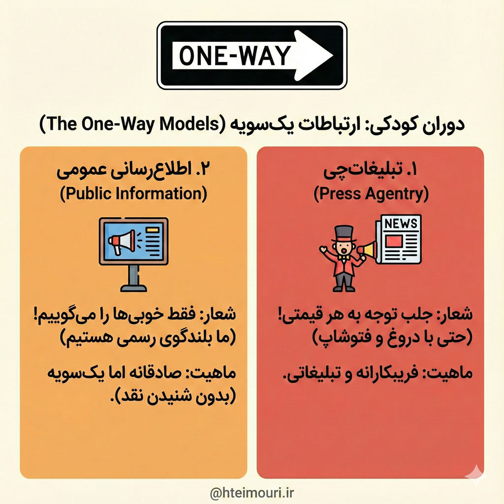 در قسمت پانزدهم، به سراغ نظریه مشهور پروفسور جیمز گرونیگ (James Grunig) و تاد هانت میرویم. آنها چهار مدل تاریخی برای روابط عمومی تعریف کردهاند که مثل آینه، وضعیت سازمان شما را نشان میدهد. بیایید ببینیم شما در کدام پله ایستادهاید؟