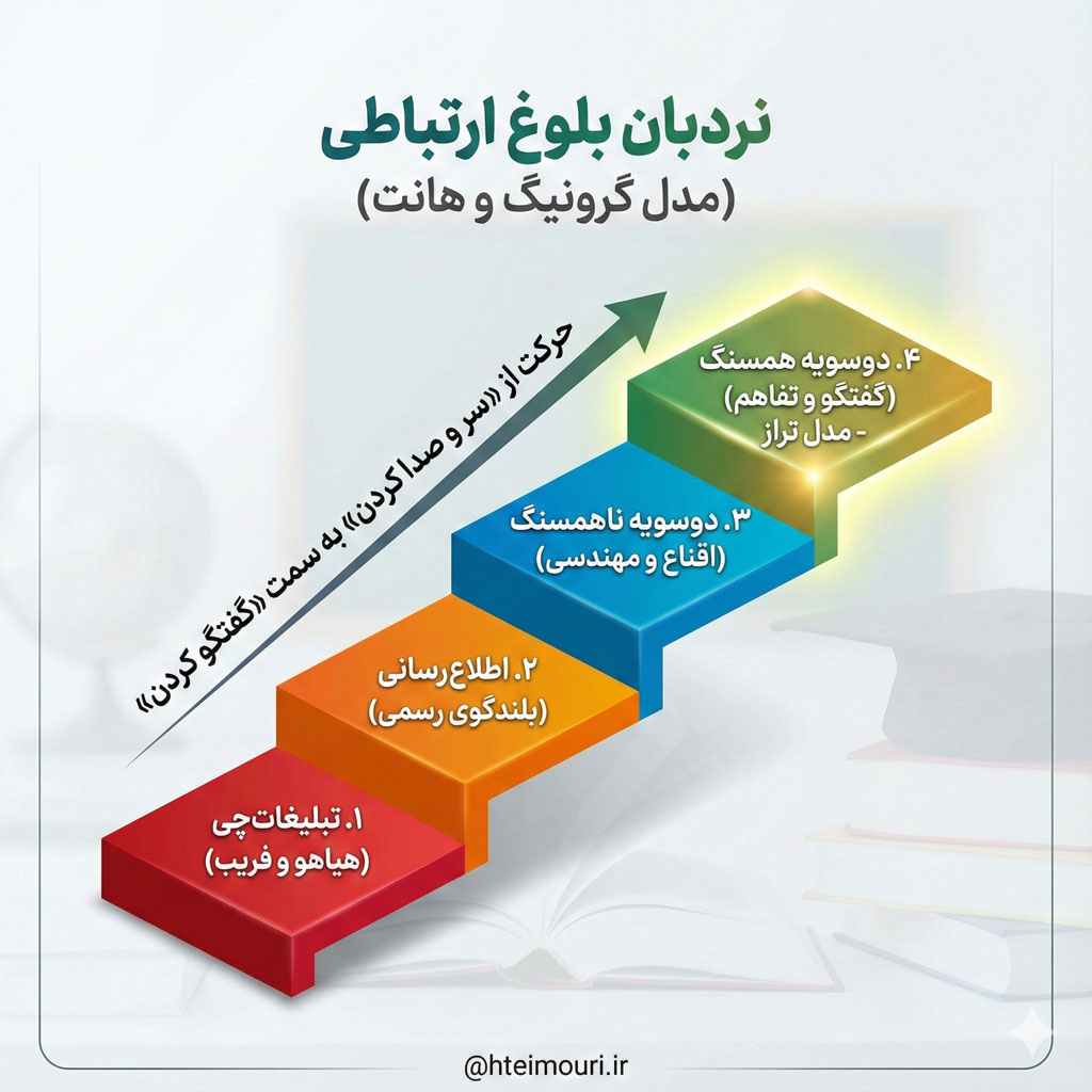 - در دانشگاه: این قله روابط عمومی است. در این مدل، دانشگاه جلسات آزاد میگذارد، نقدها را میشنود و اگر سیاستی به ضرر دانشجو باشد، آن را تغییر میدهد. در اینجا سازمان و مخاطب، برابر هستند. هدف «اقناع» نیست، «تفاهم» است.
