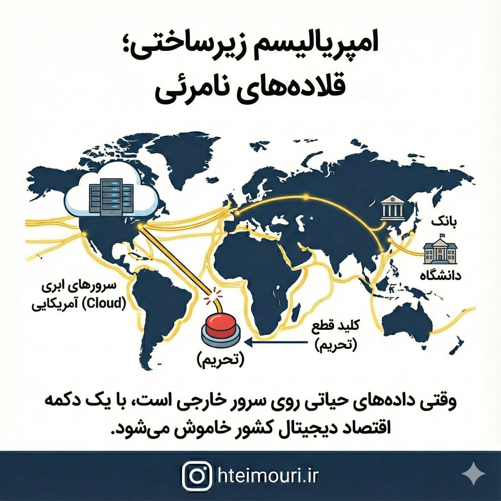 وقتی دانشگاهها، بانکها و استارتآپهای یک کشور، دادههای خود را روی سرویسهای ابری آمازون (AWS) یا گوگل میزبانی میکنند، عملاً «حاکمیت ملی» خود را واگذار کردهاند. در این حالت، کشور میزبان میتواند با فشار یک دکمه (تحریم)، کل اقتصاد دیجیتالِ کشورِ مستعمره را خاموش کند. این یعنی وابستگیِ مطلق؛ دقیقاً همان چیزی که استعمارگران قدیم آرزویش را داشتند.