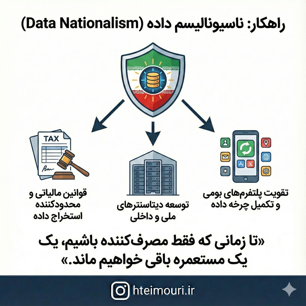 تنها راه مقابله با استعمار دیجیتال، «ناسیونالیسمِ داده» (Data Nationalism) است. کشورها باید دادهها را به عنوان «منابع ملی» (مثل نفت) شناسایی کنند.